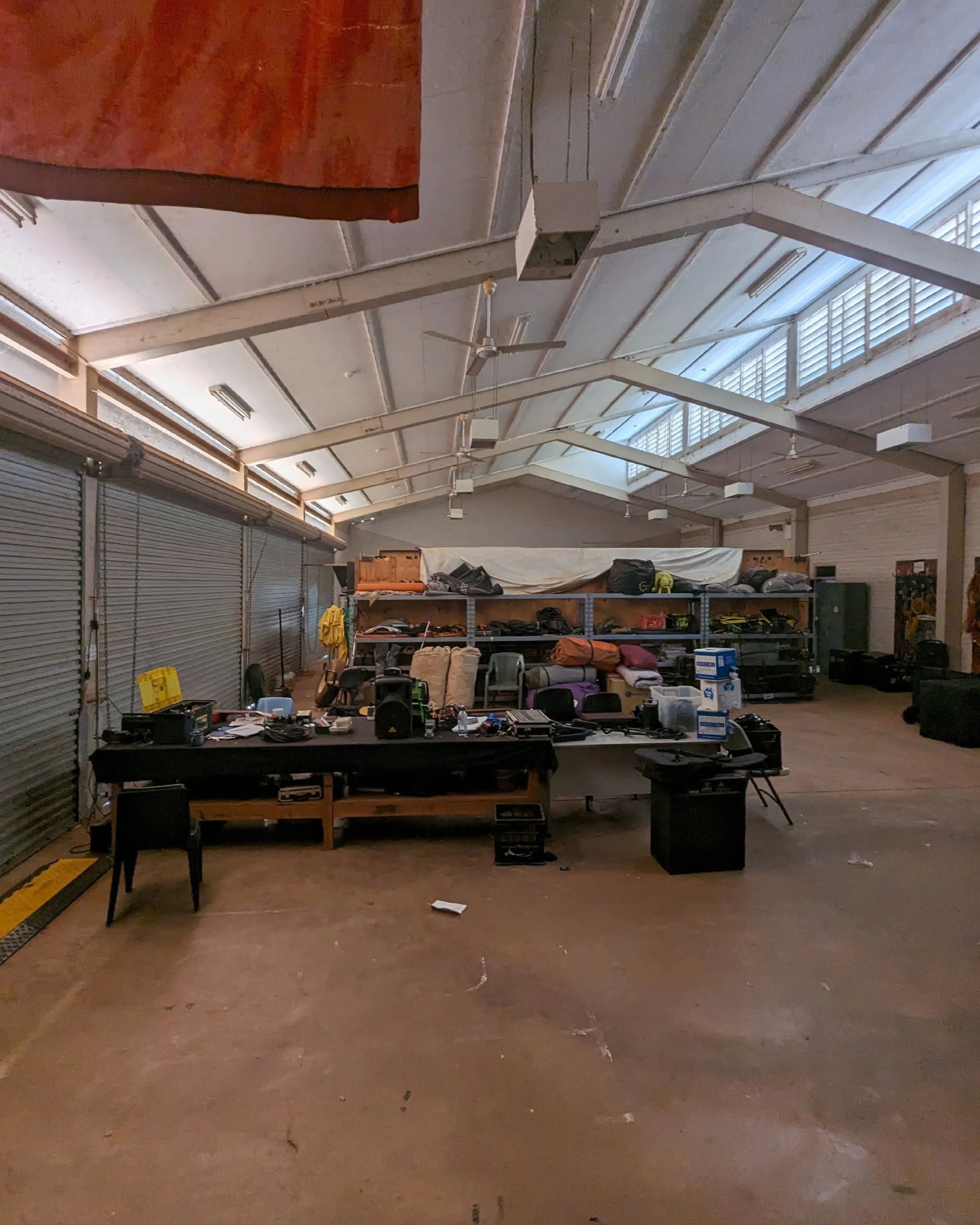 The former sports assembly hall provides a large versatile space for BRA, primarily utilised by the music and events team. It stores music equipment and gear for camping and going bush. With its high ceiling, steel trusses and sawtooth roof letting light in, it was a pleasant space to be in. The roller shutter doors running the length of the space allow vehicle and loading access plus open to the outdoor space that hosts the Desert Harmony Festival.
